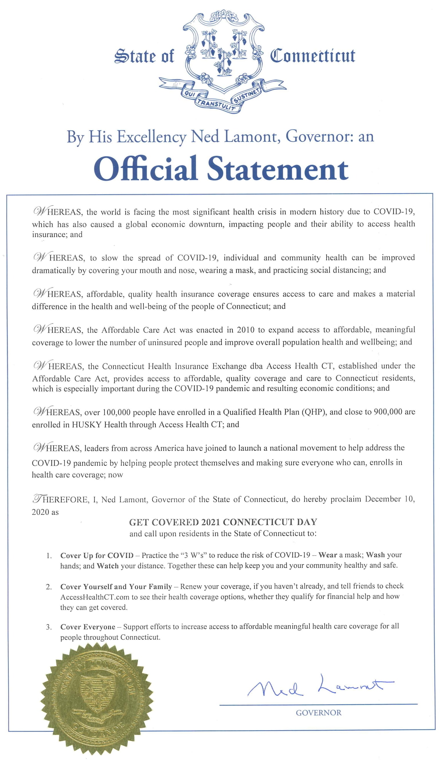 (HARTFORD, CT) – Governor Ned Lamont today announced that he has signed a proclamation declaring Thursday, December 10, 2020 as Get Covered 2021 Connecticut Day in the State of Connecticut in an effort to drive health coverage enrollment. Connecticut residents can enroll or renew their health insurance plans with the state’s marketplace Access Health CT until December 15, 2020, for coverage starting on January 1, 2021.