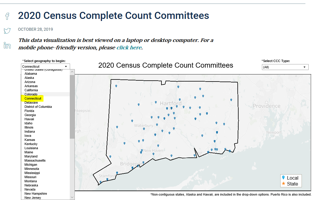 The Connecticut Complete Count Committee is dedicated to ensuring that cities and towns across the state are preparing for the 2020 Census. There are already over 100 local committees formed. Click here to find a local complete count committee near you.