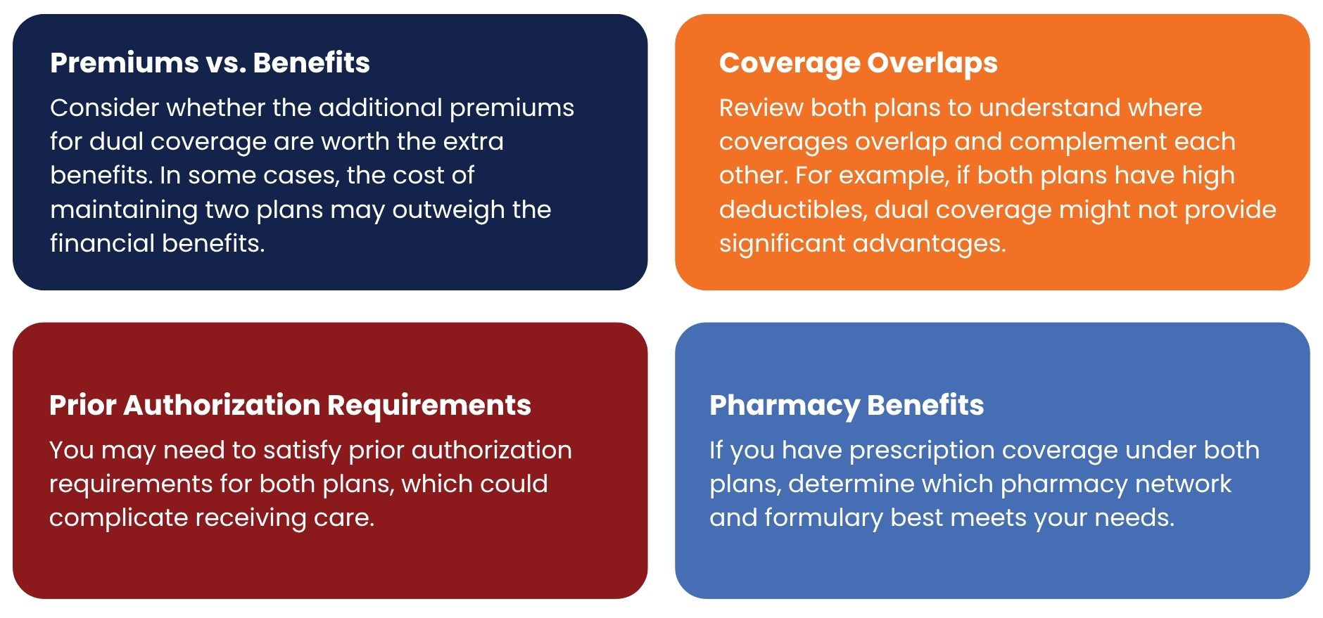 Having dual health insurance coverage means you're covered under two health insurance plans simultaneously. This typically occurs when someone has their own insurance through an employer and is also covered as a dependent on a spouse's or parent's plan, or when someone has both Medicare and supplemental coverage.