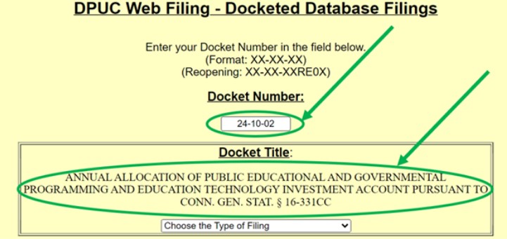 Then enter the Docket Number (24-10-02) and ensure that the correct Docket Title populates (Annual Allocation of Public Educational and Governmental Programming and Education Technology Investment Account pursuant to Conn. Gen. Stat. § 16-331cc):