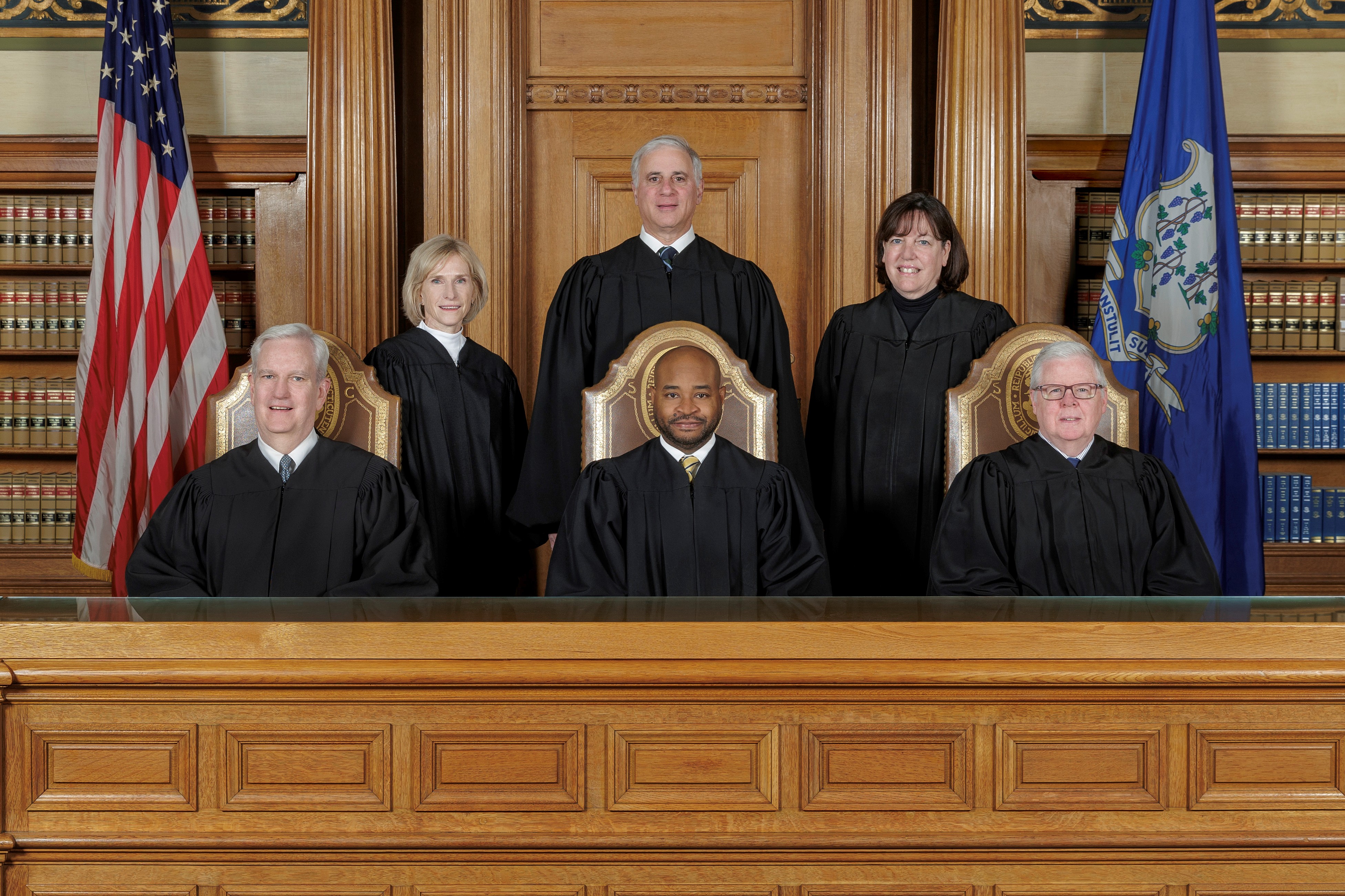 Standing from left to right: Justice Nora R. Dannehy, Justice Steven D. Ecker, and Justice Joan K. Alexander; Seated from left to right: Justice Andrew J. McDonald, Chief Justice Raheem L. Mullins, and Justice Gregory T. D’Auria.
