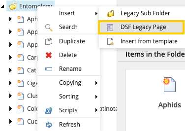 - Using the Content Tree, navigate to the folder where you wish to insert a page.