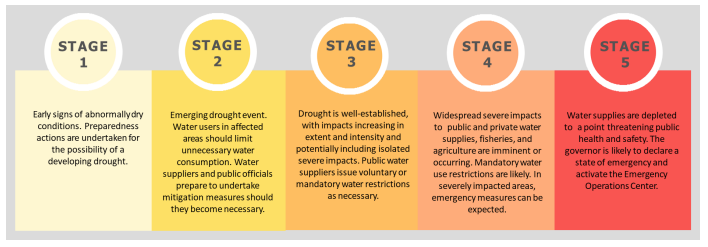 Current Status as of 11/6/25: Stage 2 Drought - Fairfield, New Haven, and Middlesex Counties. No drought stage declared for remaining counties.